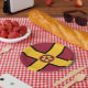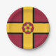 Paper plate with design with a flag of historic county of Northamptonshire, in England, Great Britain; maroon flag with a gold cross and the county’s traditional rose in the centre