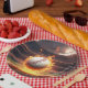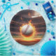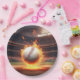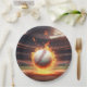 Flying baseball with flames on a ball field in a stadium background for sports birthday party.