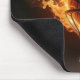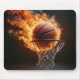 A basketball engulfed in flames is captured mid-air as it nears the hoop, emphasising dynamic motion and intensity