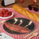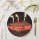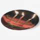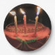 A Birthday Cake shot closeup with flaming Candles that's bright and colourful that's on a Paper Plate.