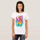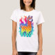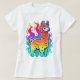 This t-shirt design showcases a funky, colourful llama with an edgy attitude. The llama is illustrated in a bold, cartoon style, with a gradient of vibrant colours ranging from orange and yellow to green and blue, giving it a fiery and dynamic appearance. The llama has a confident, almost rebellious expression, emphasised by its dark sunglasses and a slight smirk. Surrounding the llama are abstract flames and swirls in complementary neon shades of pink, red, and blue, adding to the overall energetic and cool vibe of the design. The black background contrasts sharply with the bright colours, making the design pop and ensuring it stands out. This t-shirt is perfect for those who love unique, eye-catching, and playful fashion statements.