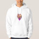 This hoodie features a simple yet striking design on a white background. At the centre of the hoodie is a vivid, heart-shaped graphic, composed of abstract patterns and fiery colours. The heart seems to be enveloped in dynamic shades of red, orange, purple, and hints of yellow, giving it a vibrant, flame-like appearance. The contrast between the bold colours and the white hoodie makes the design stand out, making it perfect for those who like a mix of warmth and energy in their clothing.