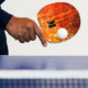 A hot orange flame design, with a monogram in black.