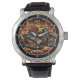 This close-up image showcases a distinctive watch face with a bold, fiery illustration. A vintage-style motorcycle with a sidecar, both adorned with vibrant orange and yellow flames, dominates the centre. Large, feathered wings extend from the motorcycle's back. The dark background highlights the fiery design, creating a dynamic and striking timepiece.