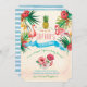 Flamingos, pineapples, hibiscus flowers and foliage adorn this modern version of a luau baby shower invitation. Bright colours and a blue banner announce your baby shower party with style. Back of invite in blue watercolored stripes.