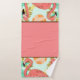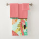 This bath hand towel set is shown in a solid colour of coral pink with flamingos, tropical leaves and chocolate brown accents stripes.