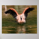 Flamingo bathing in water with open wings postcar poster