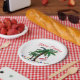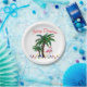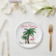 Santa flamingos with palm trees and Holiday Christmas lights party theme paper plates. Fun Holiday party plates for beach, coastal, tropical themes and more.