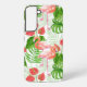 Watercolor pattern design with flamingo flowers and birds, monstera and palm leaves.