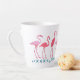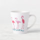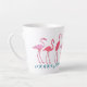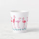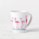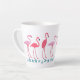 Tropical flamingos latte mug for a coastal themed kitchen. Pink flamingoes stand among little blue starfish on white mugs that come in two sizes.
