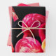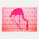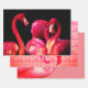 Three gift wrap sheets with image of flamingos in colours of pinks, oranges, blacks and reds.