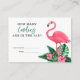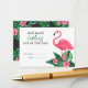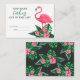 Baby shower invitation design features pink flamingo with lush green palm leaf fronds and tropical hibiscus flowers. "Aloha Baby". A tropical floral pattern with black background colour dresses up the back of the card.