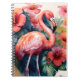 Notebook features vibrant watercolor artwork of a majestic flamingo among large hibiscus flowers the same hue as its feathers.