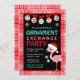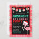 This cute and fun Christmas invitation features an adorable flamingo in a santa's hat on a pink and red plaid background. The text combines sans serif fonts for a stylish and modern look. Winter snowflakes and patterned baubles add a festive touch. This is perfect for a Christmas holiday ornament exchange swap party.