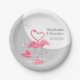 A pair of pink flamingos with necks curved to form a heart shape stand in the sea on a moonlit beach. A mid-century inspired romantic design with a retro touch created in a pink, grey and white colour scheme with a colour-change background. A customisable design for you to personalise with your own text, images and ideas. An original digital art image.