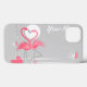 A pair of pink flamingos with necks curved to form a heart shape stand in the sea on a moonlit beach. A stylish, romantic design with a retro touch created in a pink, grey and white colour scheme with a colour-change background. A customisable design for you to personalise with your own text, images and ideas. An original digital art image.