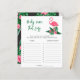 Baby shower invitation design features pink flamingo with lush green palm leaf fronds and tropical hibiscus flowers. "Aloha Baby". A tropical floral pattern with black background colour dresses up the back of the card.