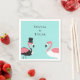 Flamingo-themed wedding paper napkins featuring a flamingo bride and flamingo groom on a turquoise background. Simply add your names, add these napkins to your cart, and enjoy your flamingo-filled wedding.