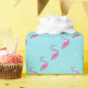 Pretty pink flamingos on a light turquoise background decorate this tropical wrapping paper, making it perfect for a birthday, baby shower, pool party, destination wedding or any summery special occasion.