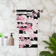 The product design features a flamingo with kaleidoscopic paisley patterns in shades of pink over black and white stripes background. This tropical bird design with personalised text makes modern and unique bath towels.
