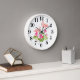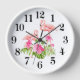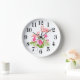 This wall clock is shown with a cute pink flamingo art print.