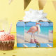 A charming flamingo, adorned with a cozy knit hat, scarf, and pink boots, is gracefully standing on a picturesque tropical beach