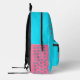Fun girls backpack in bright aqua blue. Pink flamingoes decorate the back and pocket area. Add her first initial monogram to the back. Tiny blue starfish along the sides match the starfish at the feet of the flamingos.