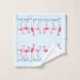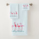 Flamingos towel set for the tropical bathroom. Pink flamingos standing among tiny blue starfish / sea stars make pretty borders on facecloth, hand towel and bath towel. Each item can be purchased separately or make a set. The border is printed at each end of the towels. The background is pale blue and can be changed in the "customise further" section.