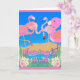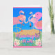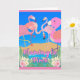 Flamingle Time, paper invitation greeting card with flamingos around a water hole with tropical flowers and a bright blue sky. Customise text on the cover and inside the card with your party event information. Art. Image, and verse copyright © Shoaff Ballanger Studios, 2023.
