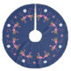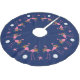 Pink flamingos on navy blue tree skirt for under the Christmas tree. Pink birds stand among little white sand dollars and sea stars. The flamingos wear festive wreaths with flowers and holly. Choose from three fabric types.