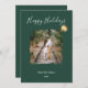 This is a modern, elegant holiday greeting card design featuring a deep forest green background. The top of the card displays the greeting "Happy Holidays" in a flowing, white calligraphy script. A distinctive, artistic brushstroke frame in the center holds a custom photo (shown here as a couple on train tracks), giving the image a painted, textured edge. A single, hand-painted style golden watercolor ornament hangs from the end of the script text, adding a festive metallic accent. The bottom of the card features clean, sans-serif white text reading "FROM OUR FAMILY" followed by a placeholder year "202x".