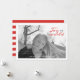Joy to the World holiday photo cards featuring the words "joy to the world", in red / black handwritten like typeface overlay, and a white border framing a picture template of cute girl blowing soap bubbles (black and white photo template). A festive nautical design, with a red and white horizontal stripes pattern, adornes the back of these Joy to the World Christmas photo cards.
