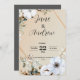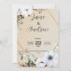 The wedding invitation card features an elegant design, with a soft ivory background adorned with delicate floral patterns in pastel shades. At the top, the couple's names are beautifully scripted in gold foil lettering, creating a stunning focal point. Below, the details of the ceremony are printed in a classic serif font, including the date, time, and venue.
