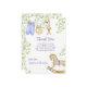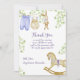 Flat Thank You Baby Shower Card features beautiful watercolor illustrations of cute baby clothes hanging on a line to dry, a cute stuffed bunny, an adorable rocking horse at the bottom of the card, and all of these items are surrounded by delicate branches with light green leaves.