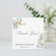 This exquisite wedding thank you card is adorned with an elegant floral motif featuring delicate roses and hydrangeas nestled among lush green leaves.
