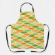 This apron has a mid-century modern design of flattened diamonds in shades of yellow, orange, and green.