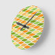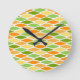 This wall clock has a mid-century modern design of flattened diamonds in shades of yellow, orange, and green.