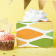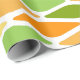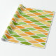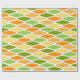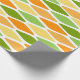 This wrapping paper has a mid-century modern design of flattened diamonds in shades of yellow, orange, and green.