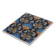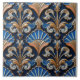Art Deco ceramic tile with seamless pattern of blue, gold, and silver floral designs on a dark blue background, symmetrical arrangement, intricate details, vintage style, elegant and ornate, repeating motif, decorative art.