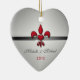 Your first Christmas together as a couple is special. Commemorate that first holiday season with this heart shaped white, red and silver design Fleur de Lis ornament featuring a red Fleur de Lis symbol with a heart as its centre. Personalise on the front with your names and the year. The back reads Our First Christmas. Keep the text or change it using the template.