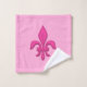 Towel set in a classic fleur de lis (fleur-de-lis) pattern in deep fuchsia pink on a pastel pink background