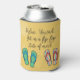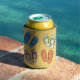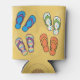 Can Cooler with Flip Flop Bright design. Text: "Relax... Unwind... Get in a flip flop state of mind." With all the stress of the modern world, sometimes it's not easy to chill out. Keep your hands warm, your cans cold, and your spirit 100% chill. Fits any standard 12 oz. can. Dimensions: 3"diameter, 3.75"h. Collapsible foam material makes for easy storage. Proudly made in the USA.