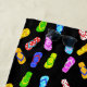 This beautiful beach towel features an adorable pattern of flip flop sandals in different colours and patterns on a black background.