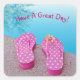 Pink and white polka dot flip-flops with yellow daisy by swimming pool.
