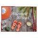 This Warmest Wishes beach holiday greeting postcard features a cute pair of orange flip flops and sun hat. There are seashells and a watercolor palm tree decorated with Christmas tree string lights, all on a wooden background.