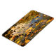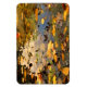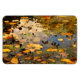 This brilliantly colored fine art flexible magnet features an abstract depiction of autumn leaves floating in a pond. The lovely fall foliage colors include red, orange, yellow, brown, gold and green. White clouds, blue sky and black branches are reflected in the water. All form a lovely impressionistic pattern.