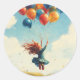 A young girl in a flowing blue dress is lifted into the sky by a bundle of colourful balloons, her red hair streaming in the wind against a bright, dreamy background.