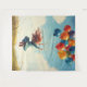 A young girl in a flowing blue dress is lifted into the sky by a bundle of colourful balloons, her red hair streaming in the wind against a bright, dreamy background.