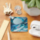 Abstract of translucent blue glass formed into loops and curves like floating streams of water dancing against a neutral grey background. A shallow depth of field gives the glass three dimensional reach.