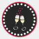 Fun round wedding, anniversary, or engagement stickers, with cartoon champagne glasses toasting each other, with little hearts floating up. The black background has white polka dots around the edge and a dark pink frame. Customise to add any text you want. Great with our matching engagement party invitations.